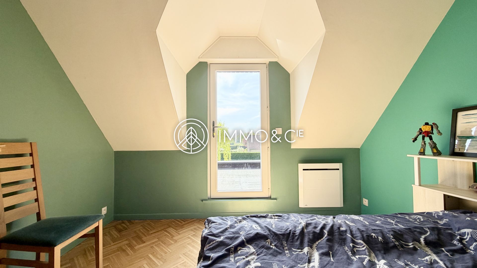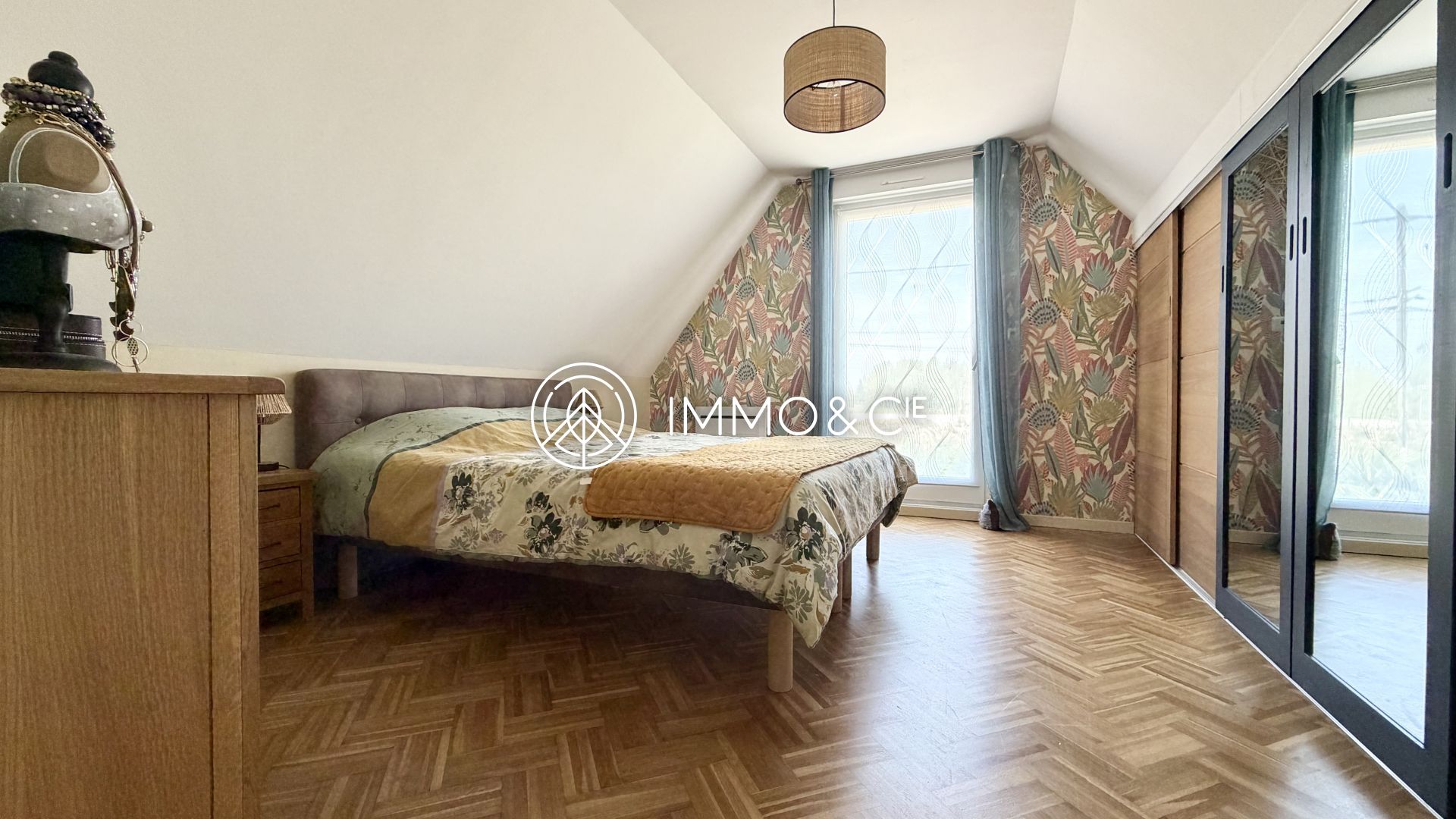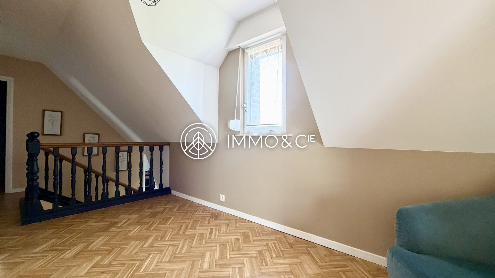 À l’étage, revêtu d'un parquet chêne massif qui apporte une touche chaleureuse à l’ensemble, la pallier distribue quatre chambres spacieuses avec rangements intégrés ainsi qu'une salle de bain moderne dotée d’une baignoire et d’une douche.