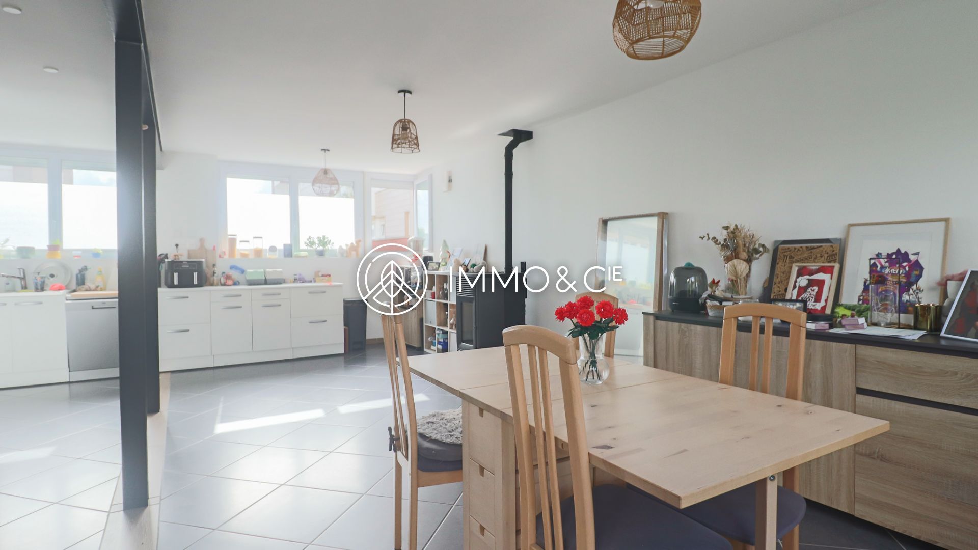 Le premier étage propose un lumineux espace de vie comprenant un salon ouvert sur la salle à manger, agrémenté d’un poêle à pellets, ainsi qu’une cuisine équipée intégrée à l’ensemble. L’espace est baigné de lumière grâce à sa double exposition traversante.
