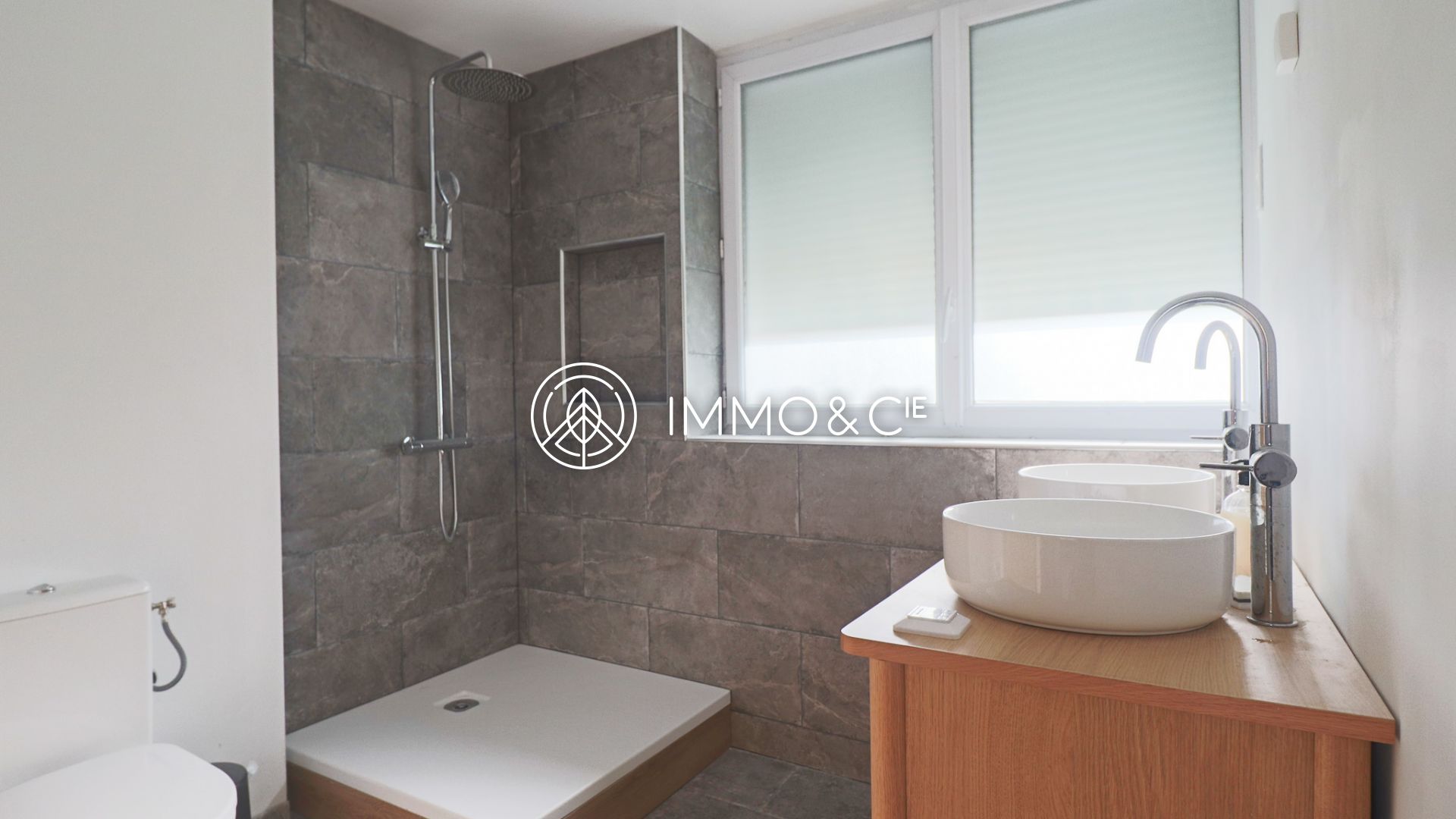 Maison bel étage, 100 m², 3 chambres, deux salles de bains, jardin, garage et stationnement privatif.