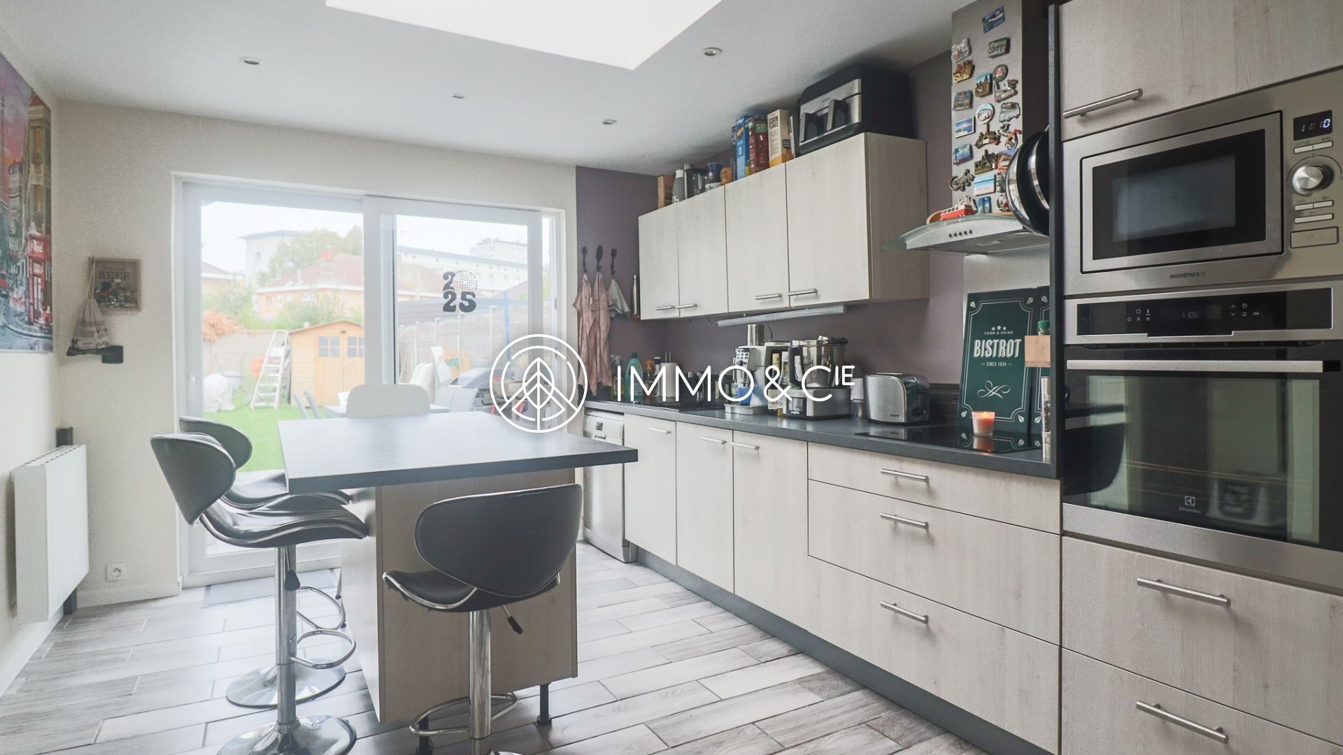 Une cuisine moderne et équipée, avec îlot central, complète cet espace. L’ensemble bénéficie d’une belle luminosité grâce aux grandes fenêtres offrant une vue dégagée sur le jardin clos, idéal pour profiter des beaux jours.