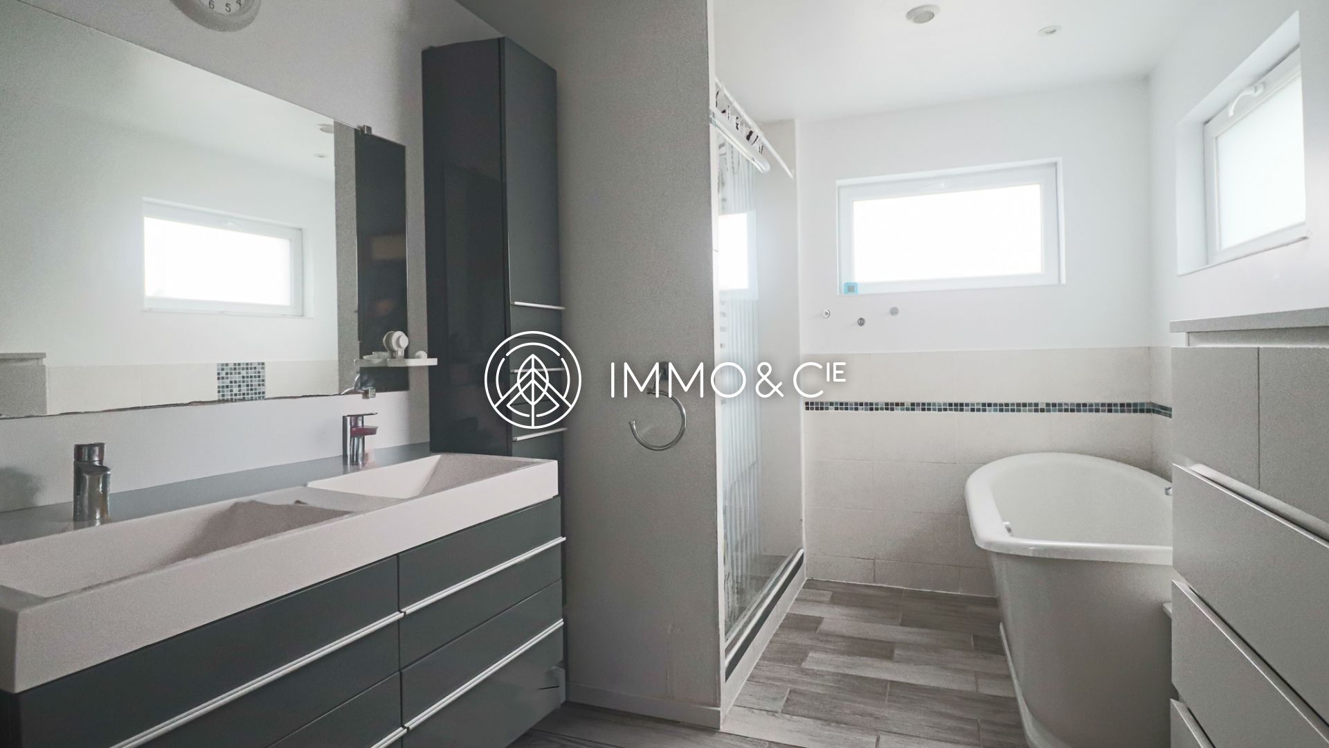 Le rez-de-chaussée comprend également une salle de bain spacieuse avec baignoire, douche et double vasque, apportant un confort quotidien.