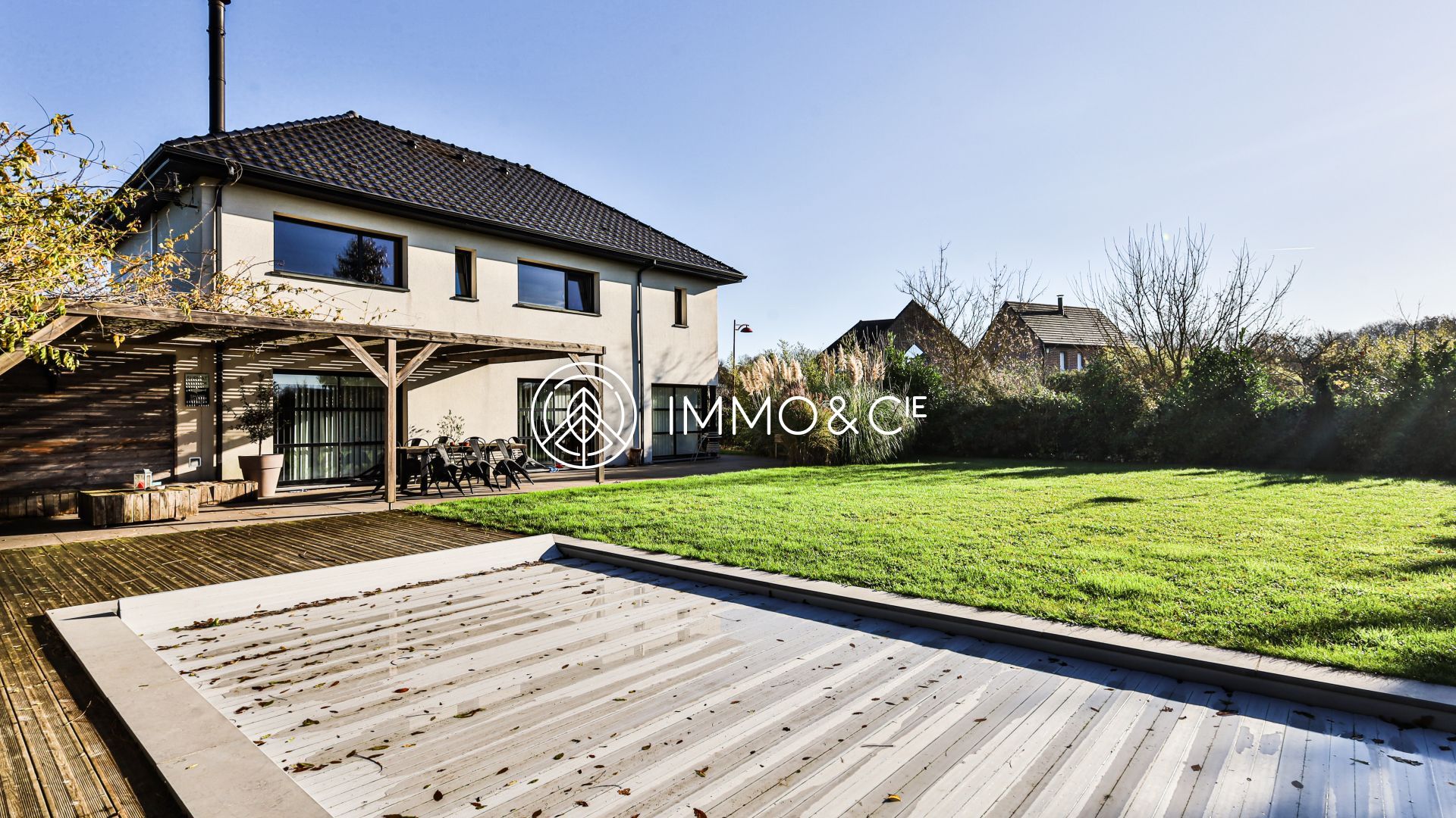 Maison Contemporaine individuelle de 170 m² habitables, 4 chambres, 2 salles de bain, jardin, garage et piscine.